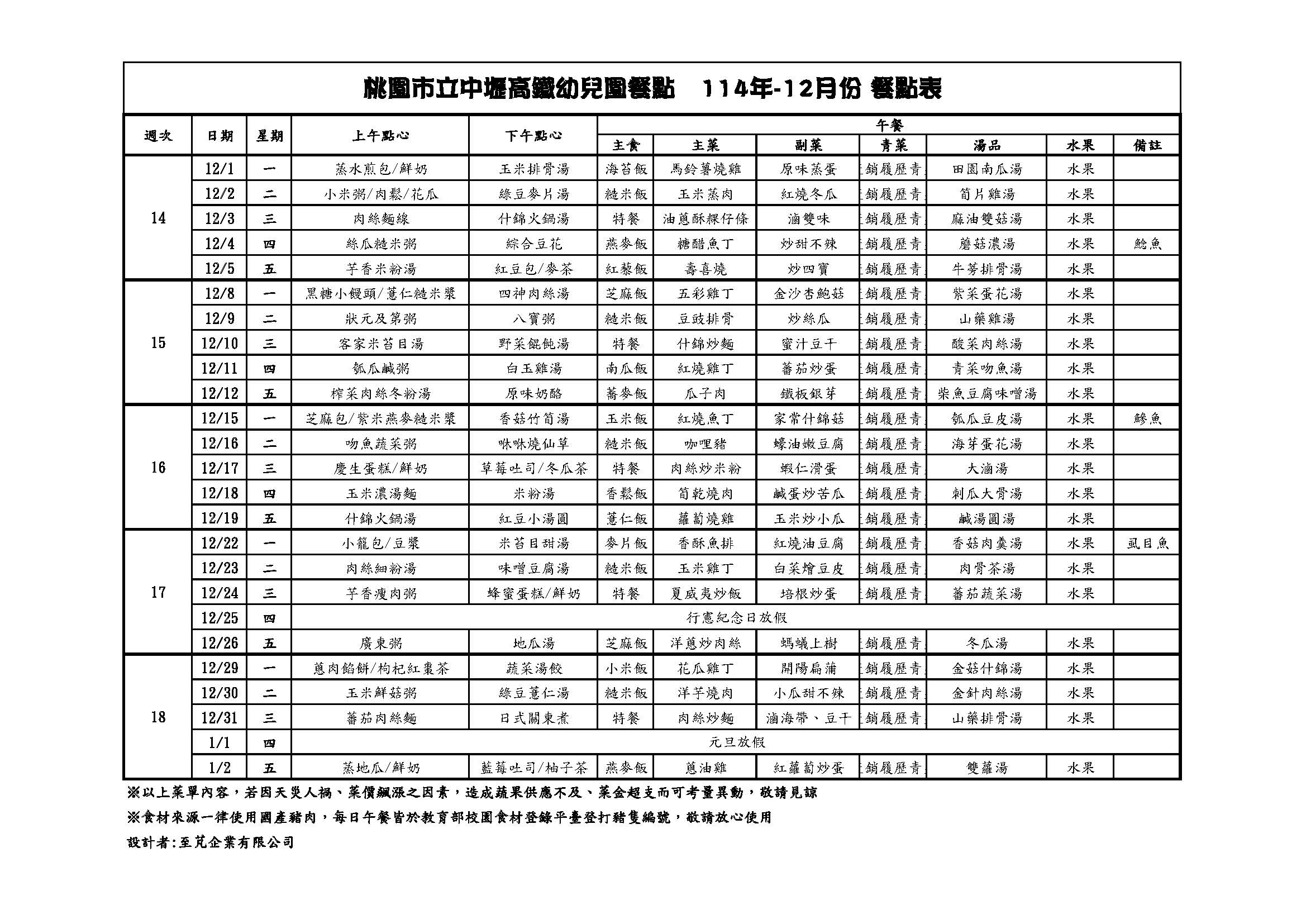 中壢高鐵幼兒園114年-12月餐點表