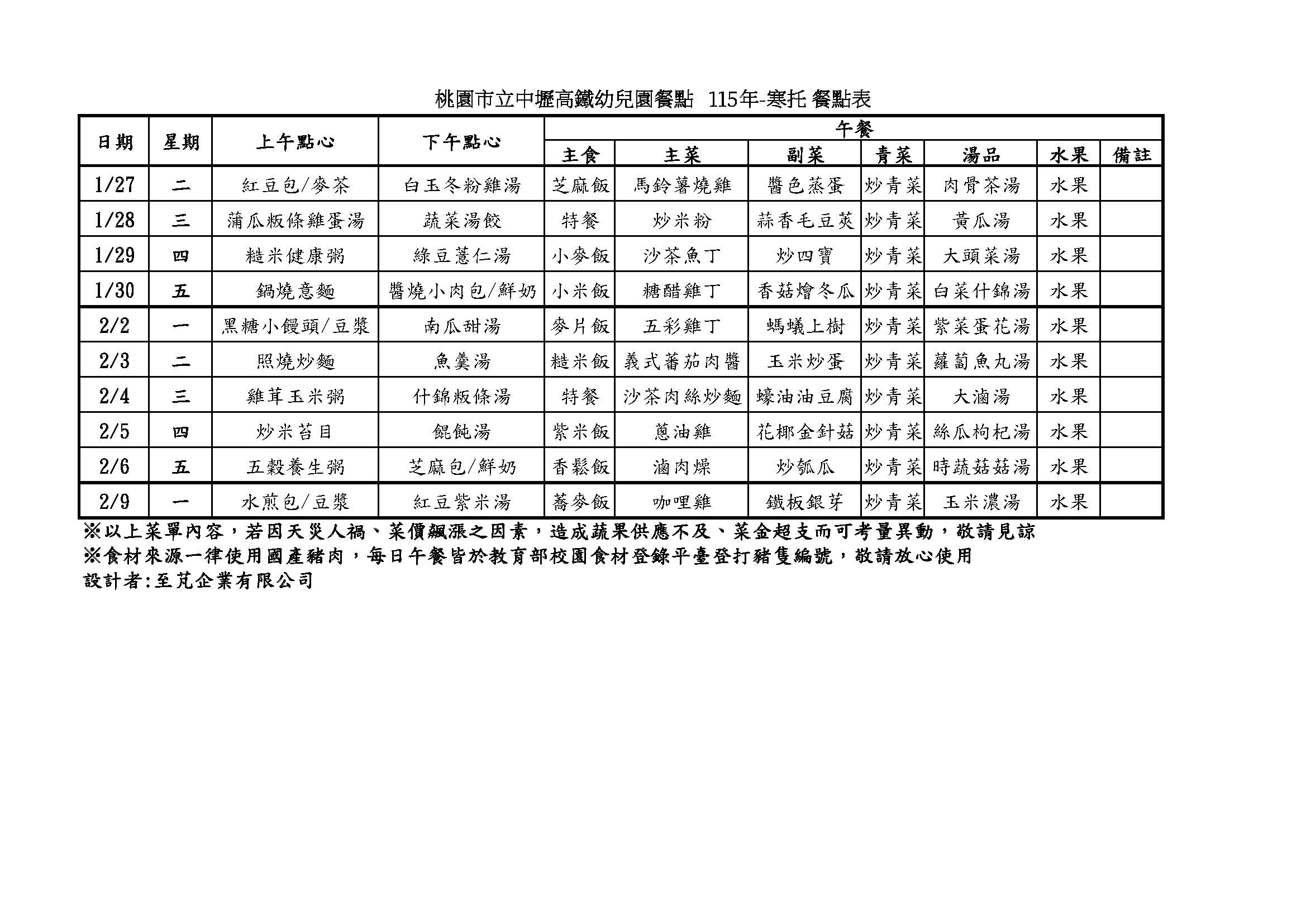 115年中壢高鐵幼兒園 寒托 餐點表
