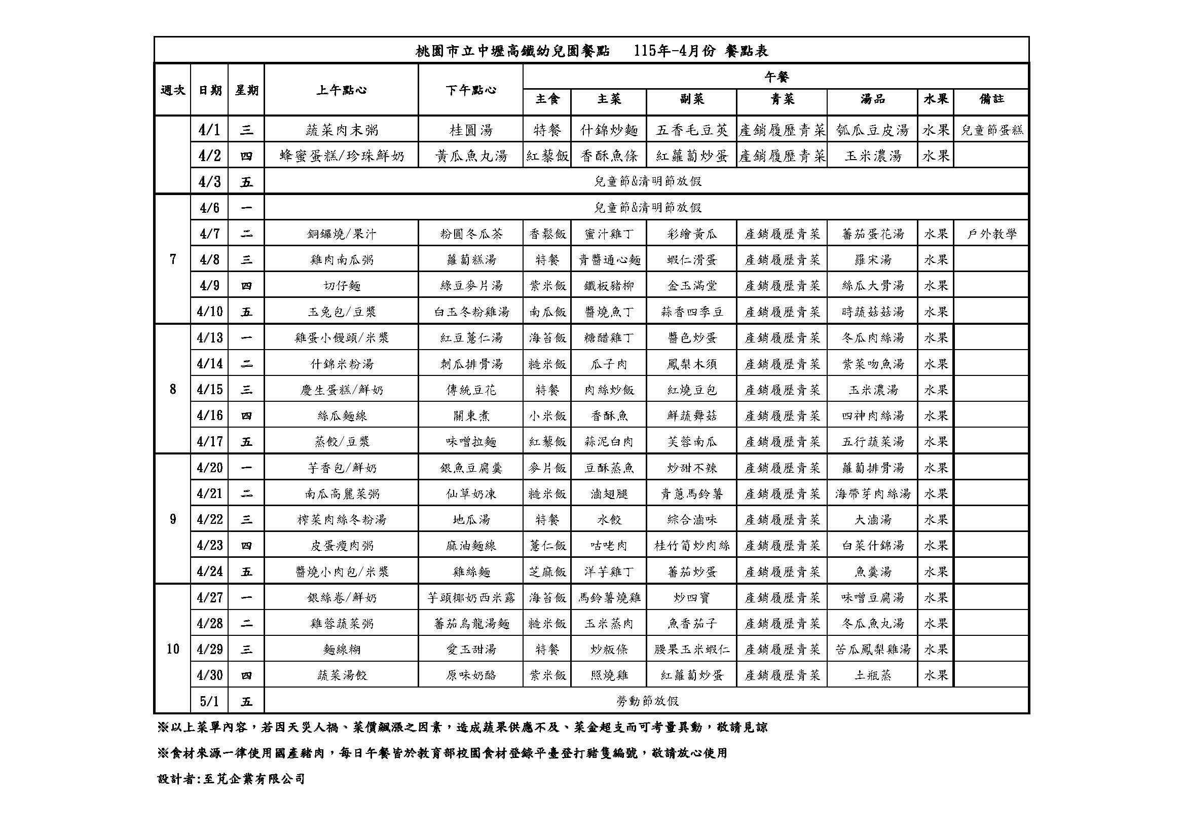 114學年度中壢高鐵幼兒園 115年-4月餐點表